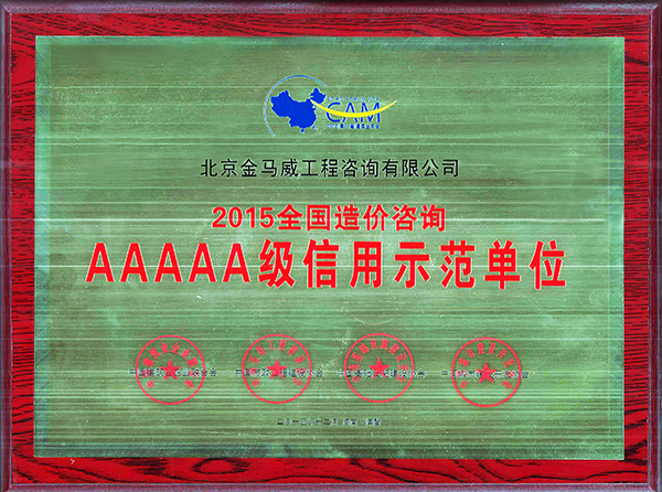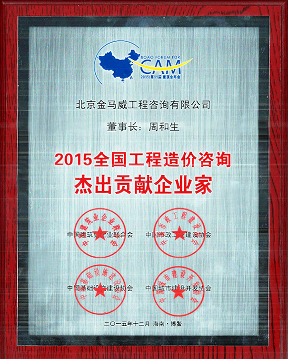 2015年12月25日,由中國(guó)建筑業(yè)企業(yè)聯(lián)合會(huì)發(fā)起,聯(lián)合中國(guó)基礎(chǔ)設(shè)施建設(shè)協(xié)會(huì)、中國(guó)市政工程建設(shè)協(xié)會(huì)等單位聯(lián)合主辦的“博鰲論壇·2015(筑業(yè)年會(huì)”在海南博鰲順利召開, 年會(huì)現(xiàn)場(chǎng)同時(shí)發(fā)布了2015年度優(yōu)秀企業(yè)和優(yōu)秀人物等以及2015中國(guó)建筑業(yè)優(yōu)秀企業(yè)和人物的頒獎(jiǎng)榜單,金馬威榮獲“2015全國(guó)造價(jià)咨詢AAAAA級(jí)信用示范單位”,周和生董事長(zhǎng)榮獲“2015全國(guó)工程造價(jià)咨詢杰出貢獻(xiàn)企業(yè)家”榮譽(yù)稱號(hào)。