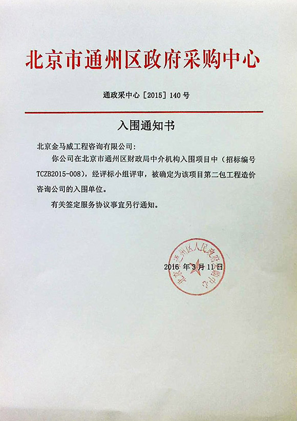 3月11日,經(jīng)公開(kāi)招標(biāo),公司入圍“北京市通州區(qū)財(cái)政局中介機(jī)構(gòu)入圍評(píng)選采購(gòu)項(xiàng)目”(招標(biāo)編號(hào):TCZB-2015-008)。據(jù)了解,一共有多家工程造價(jià)咨詢(xún)公司參與了投標(biāo),北京金馬威工程咨詢(xún)有限公司經(jīng)評(píng)標(biāo)小組評(píng)審,被確定為該項(xiàng)目第二包工程造價(jià)咨詢(xún)公司的入圍單位。