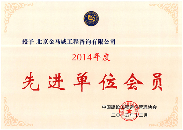 公司榮獲中國建設(shè)工程造價管理協(xié)會“2014年度先進(jìn)單位會員”稱號,湖北分公司經(jīng)理嚴(yán)俊榮獲“先進(jìn)個人會員”稱號。